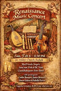 A variety of Sunshine Coast performers, including the RenFriends Singers, Coast Shakespeare Fairy Band, SunCoast Viol Consort & BC Viols, and special guests Caitlin Bradley Beaupré, Janice Brunson, Simon Gidora & Isabella Perron, were joined by friends from Vancouver, Texada Island, and Nanaimo.